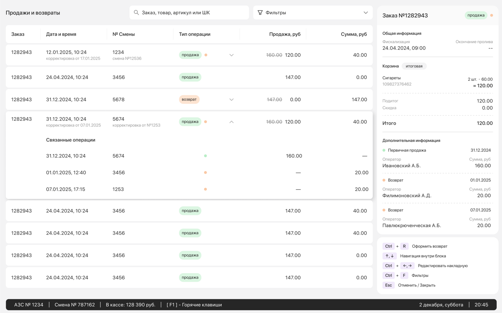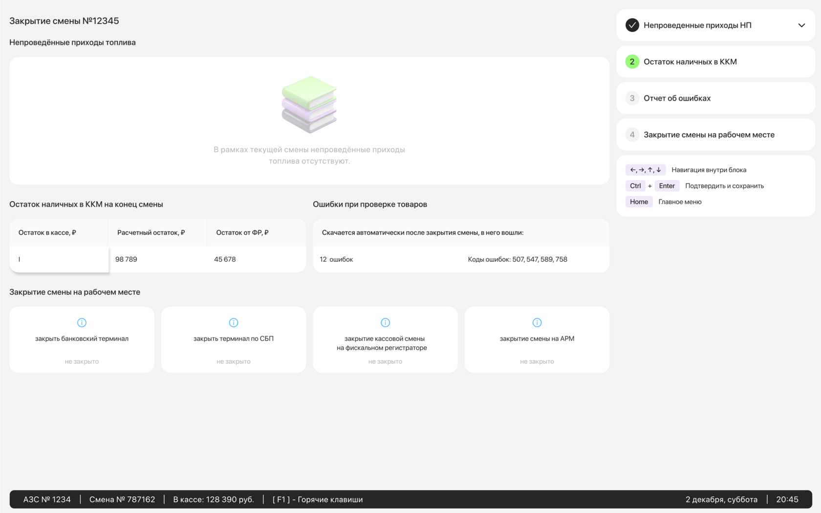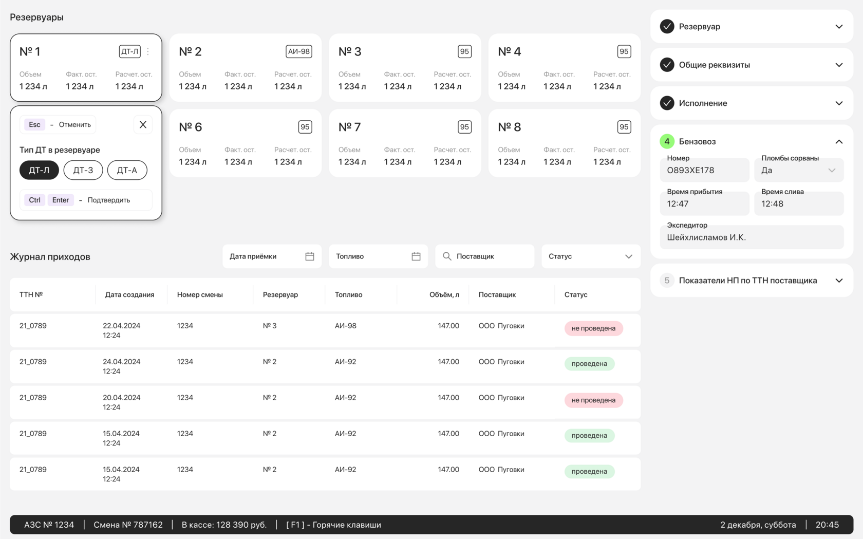 ключевая часть — это управление колонками и платежами: оператор может в реальном времени отслеживать статусы, устранять ошибки, закрывать или возвращать транзакции, оформлять приходы топлива в документы и открывать или закрывать смену с подсчетом всех ключевых показателей